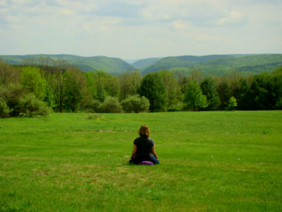 woman meditating in field at light on a hill retreat center